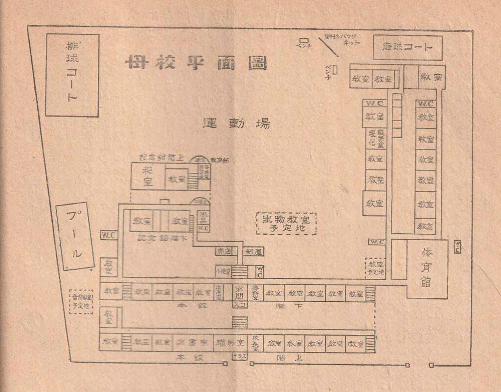 「母校平面圖」には「生物敎室予定地」、「音樂敎室予定地」とあり、第四期復旧工事を終えて第五期復旧工事を待つ状況であることと共に、このときの建物の配置から原状(空襲による焼失以前)が分かります。現況と較べると、テニスコート(庭球コート)が狭く、バレーボールコート(排球コート)は校地の西端にあって、現在テニスコートが広がる場所にはまだ教室棟があります。